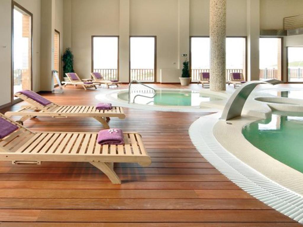 Disfruta de una amplia piscina climatizada equipada con chorros subacuáticos a presión, reductores, jacuzzi, géiser, lámina de agua y cuellos de cisne.